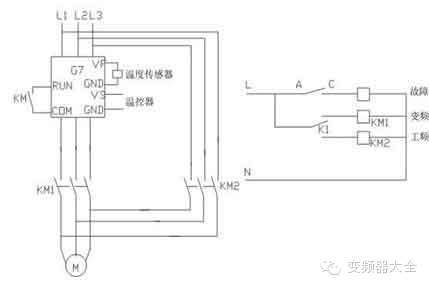 具體方法是:在保證冷凍機(jī)組冷凍水流量所需前提下,確定一個冷凍泵變頻器工作的最小工作頻率,可將其設(shè)定為下限頻率。水泵電機(jī)頻率調(diào)節(jié)是通過安裝在系統(tǒng)管道上溫度傳感器測回水溫度。溫控器將其與設(shè)定值進(jìn)行比較。當(dāng)冷凍回水溫度大于設(shè)定值時,變頻器輸出上限頻率,水泵電機(jī)高速運(yùn)轉(zhuǎn);當(dāng)冷凍回水溫度小于設(shè)定溫度時電機(jī)以設(shè)定的頻率曲線工作。系統(tǒng)圖如下: